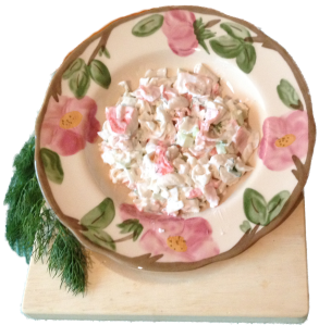 Chop or slice the crabmeat into smaller bits and combine with all the rest of the ingredients in a good-sized bowl. Use real crab or imitation in this recipe. I use the imitation crab because I like it and it’s a LOT more affordable. Adjust the horseradish and lemon to suit your taste for sparkiness. My fave for the horseradish is Ingelhoffer’s Horseradish Sauce. Cool in refrigerator before serving. Goes great with Captain’s Wafers.